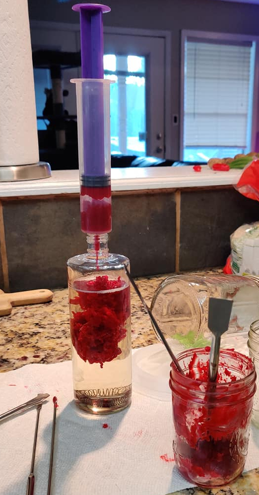 The best way to empty these globes is by draining the liquid into another container. Preferably a glass jar. Place the globe back on a base and melt the wax and then pour that into another jar or into a large hydroponic syringe if you have one. The syringes are preferable for a number of reasons. If using a jar or another container it is difficult to remove 100% of the wax from the jar. The older formula has a tendency to stick to glass if it is not coated in surfactant, but it also easily clouds if agitated in master fluid. The syringe allows the wax to be injected while cool which solves for all of the above issues. When done successfully it will look like a brain floating in the globe.