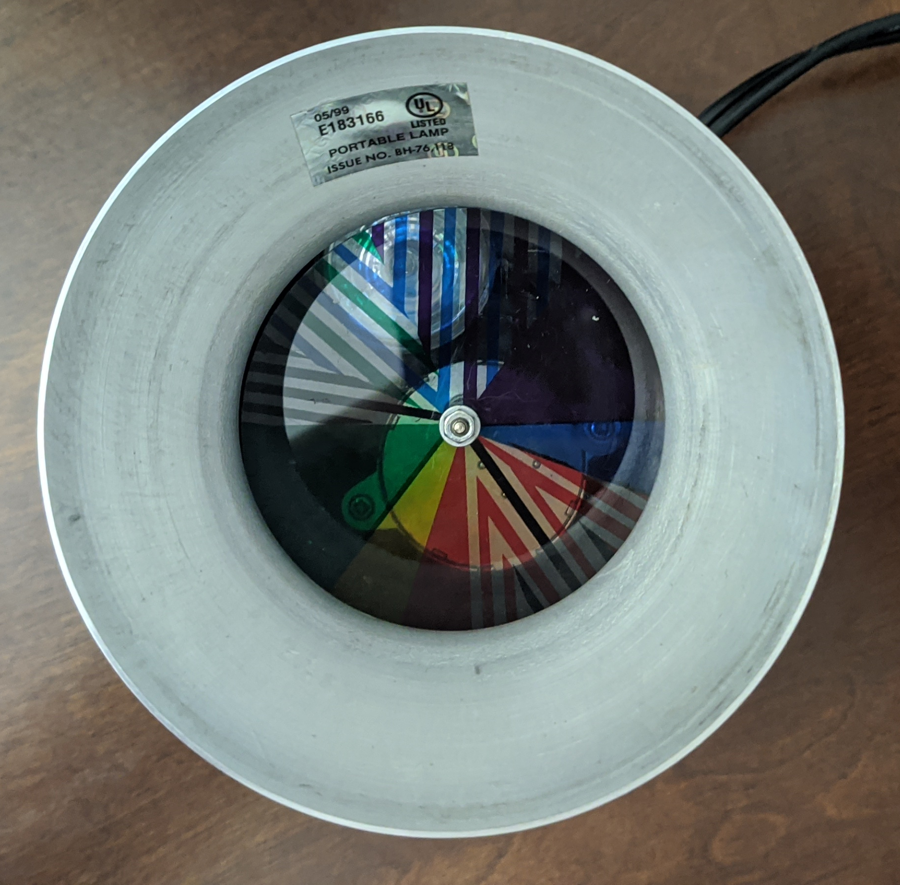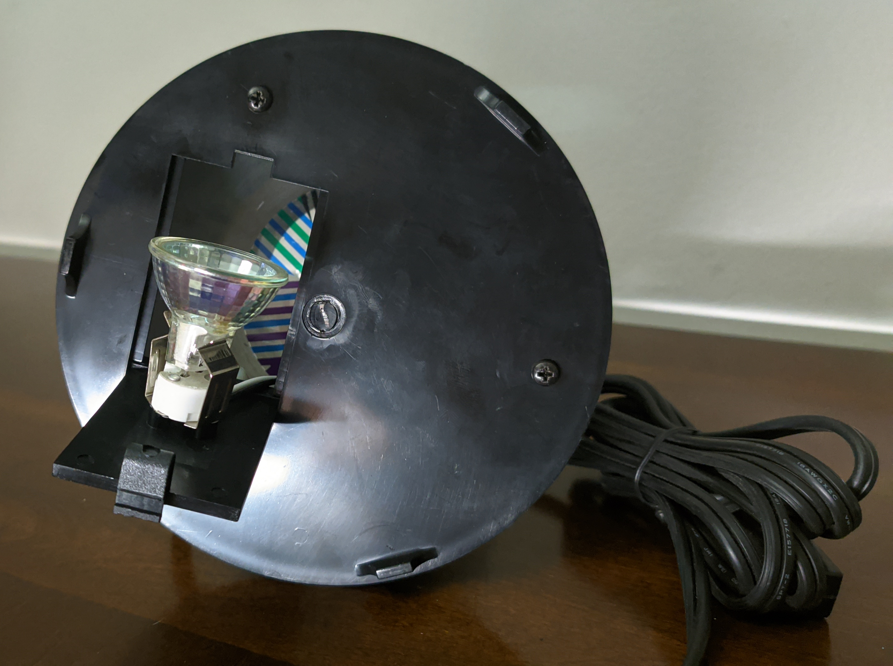 Rather than being a traditional lava lamp, it shared more in common with fiber optic lamps. It used a halogen bulb beneath a motorized color wheel, but instead of projecting light through fiber strands, it illuminated a frosted glass globe, creating a soft, shifting glow. The box label suggests it may have also been sold under the name “Orb.”