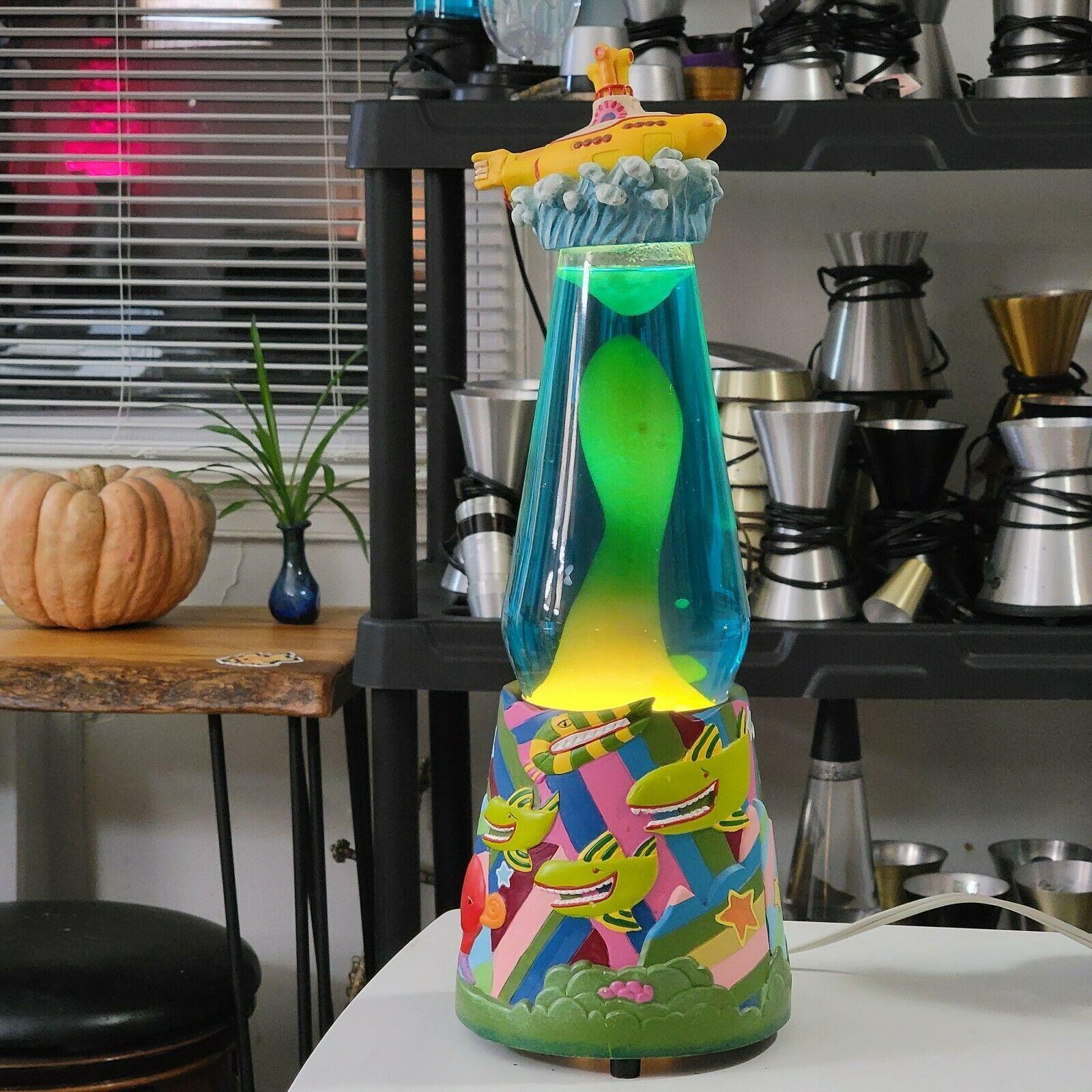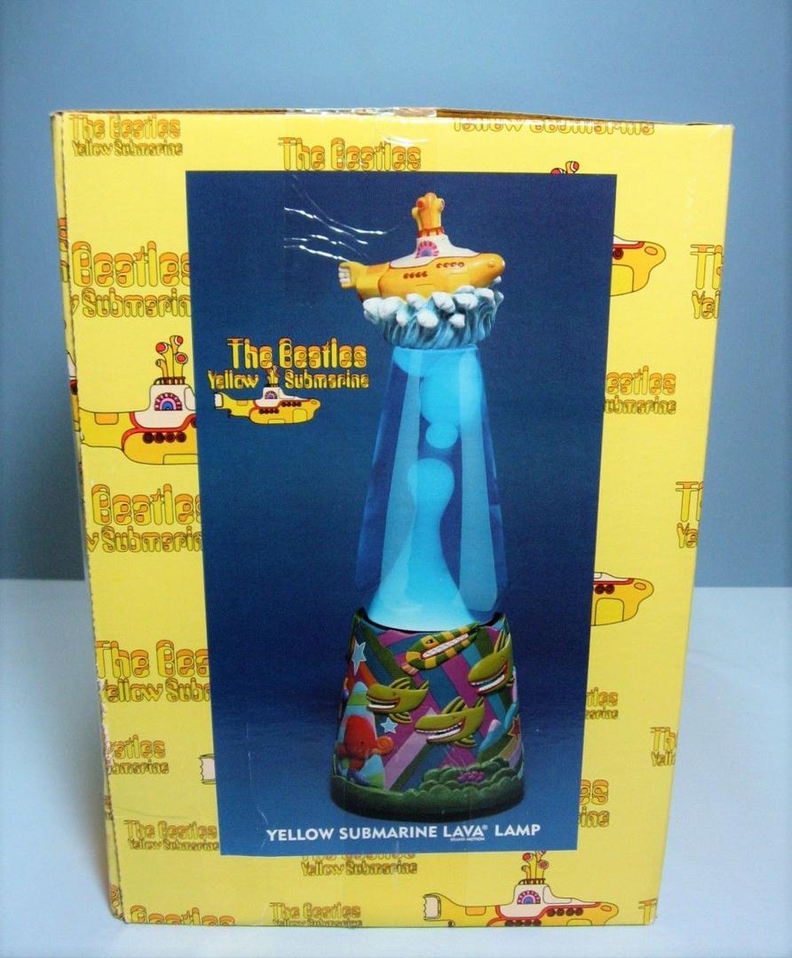 Subafilms, holder of the Yellow Submarine album rights from The Beatles, partnered with Lava Lite and Lyon Motion (later known as Vandor) to create a series of officially licensed promotional lava lamps. These lamps feature a 52 ounce globe with blue liquid and white wax, paired with a colorful base and cap decorated in a psychedelic Yellow Submarine theme.