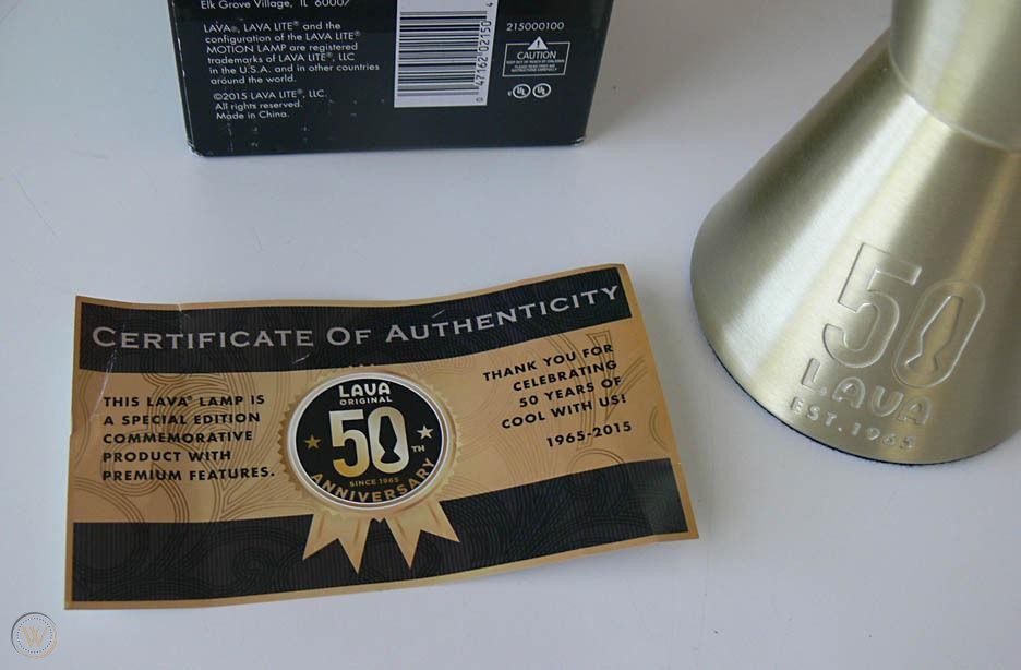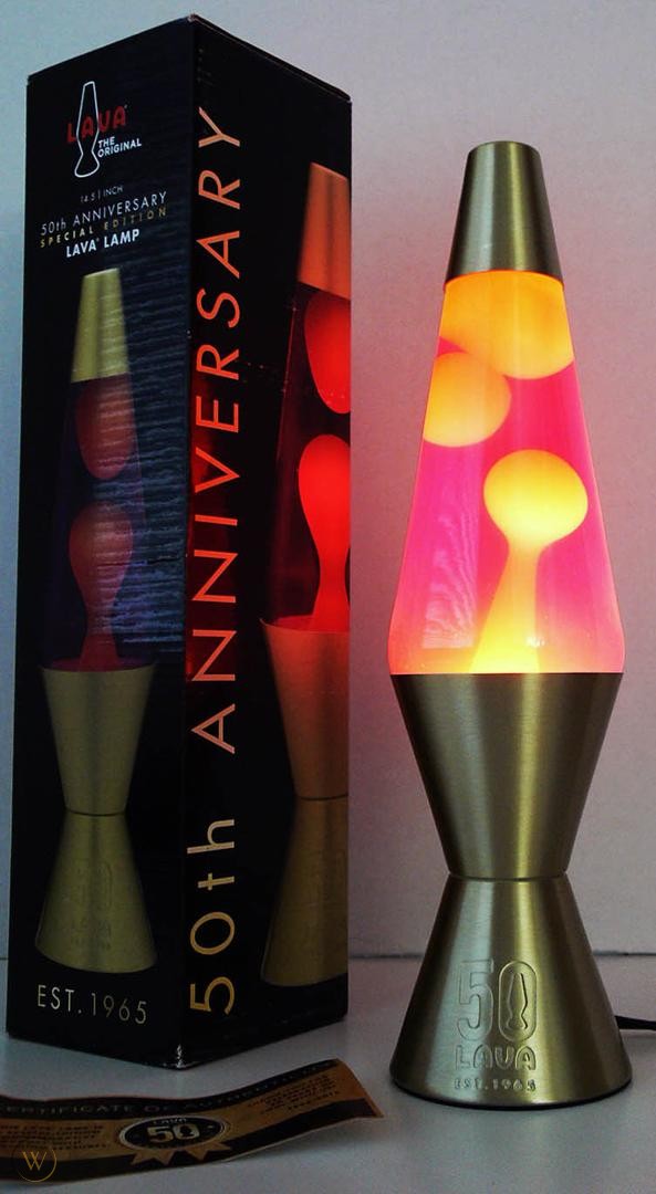 Lava Lite celebrated their 50th anniversary with a full line of gold toned lamps with stamping on the bases indicating they were special 50th anniversary lamps. A special run of 1965 of each model was made with a numbered card.