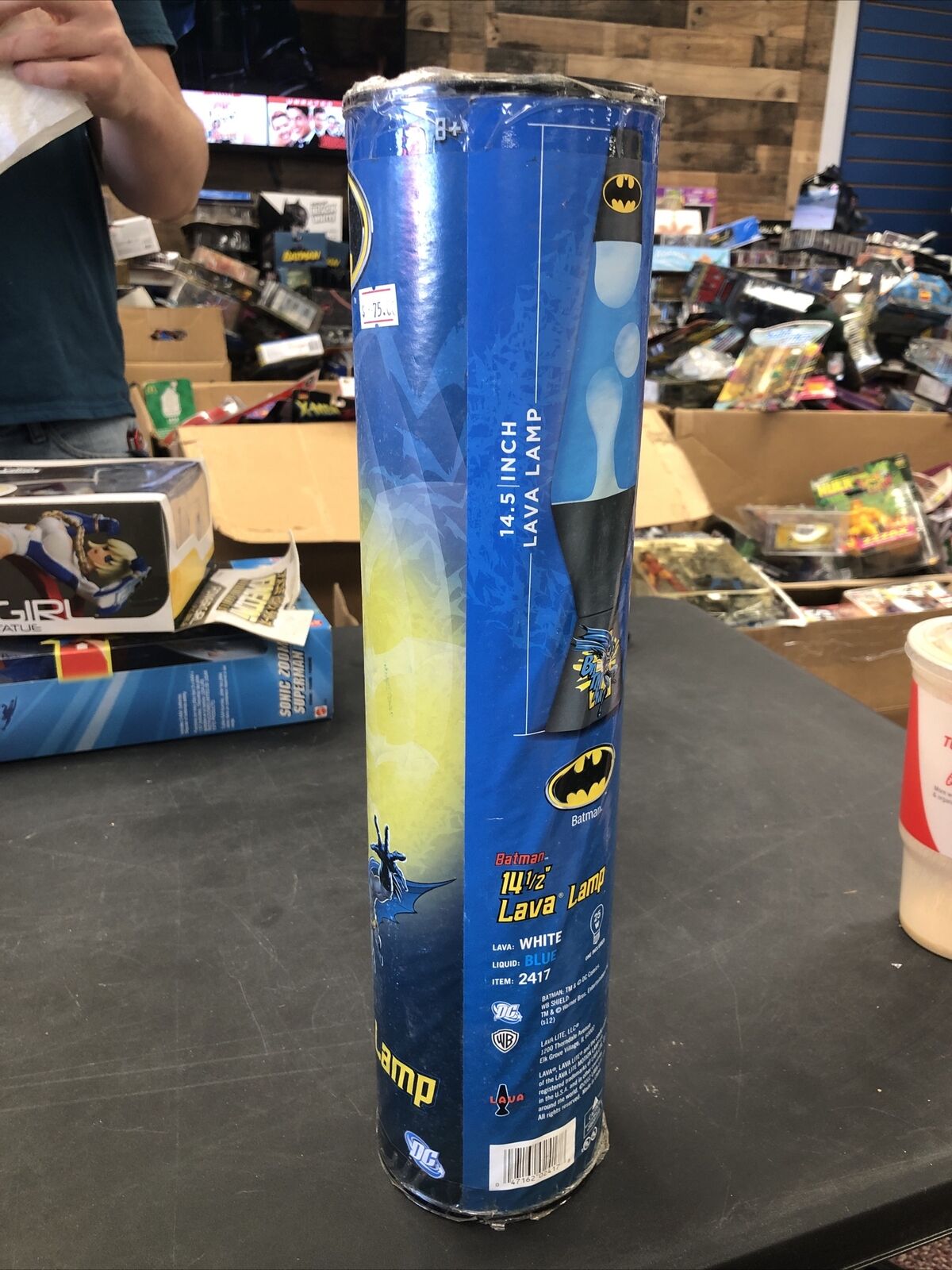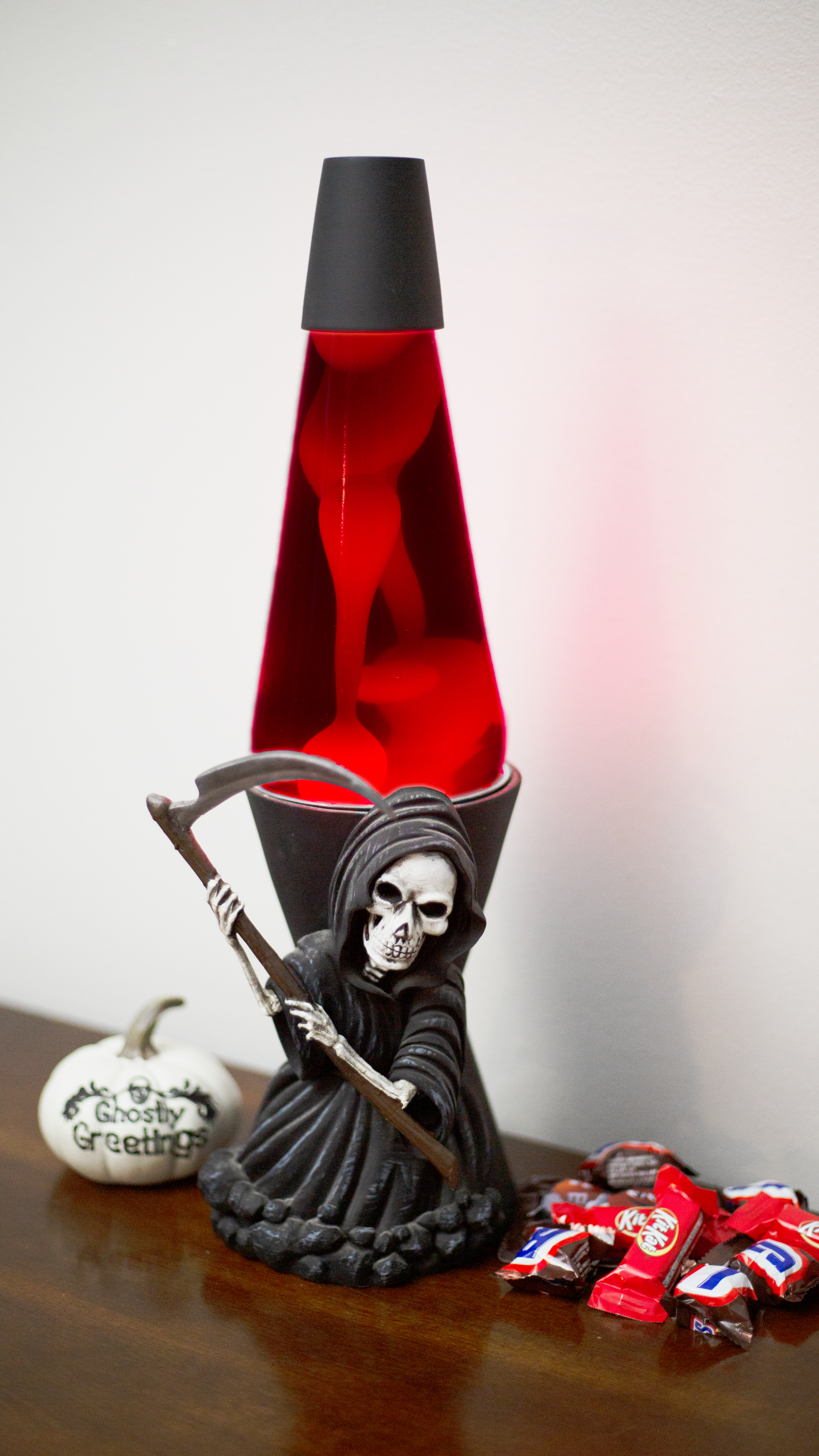 The Grim Reaper is a resin lamp with a 32oz globe with clear liquid and white black wax. It features a scythe that detaches from the base for easy shipping. Since it was shipped in tube container there was not much room for the scythe causing most of them to be broken during shipping. Even in the stock image a break is visible below the upper hand.