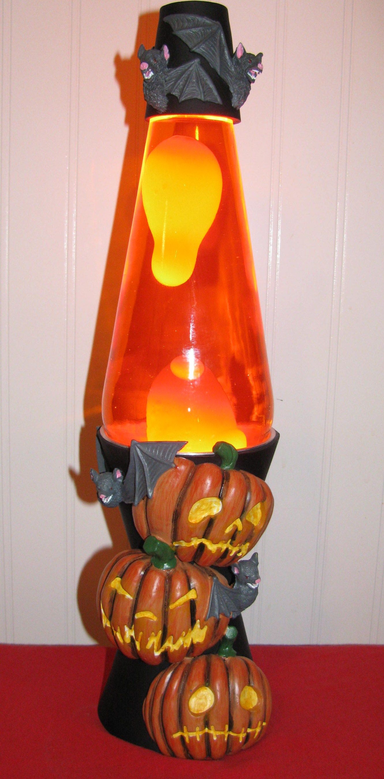 The Jack-O-Bats is a resin lamp with a 32oz globe with orange liquid and white wax. It features bats and jack-o-lanterns that looks very spooky. A must have for Halloween!