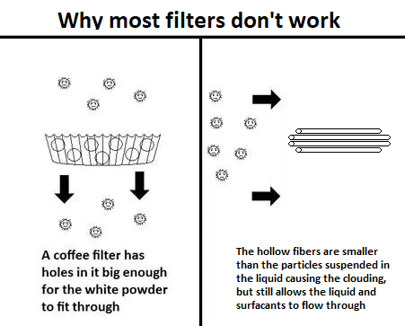 The recommended filter to use is a Hollow Fiber Membrane filter. This type of filter uses hollow fibers and, most importantly, contains no carbon, which means it does not damage the surfactants in the master fluid. These filters are sold by various manufacturers, but the brand that I have successfully used is Sawyer.