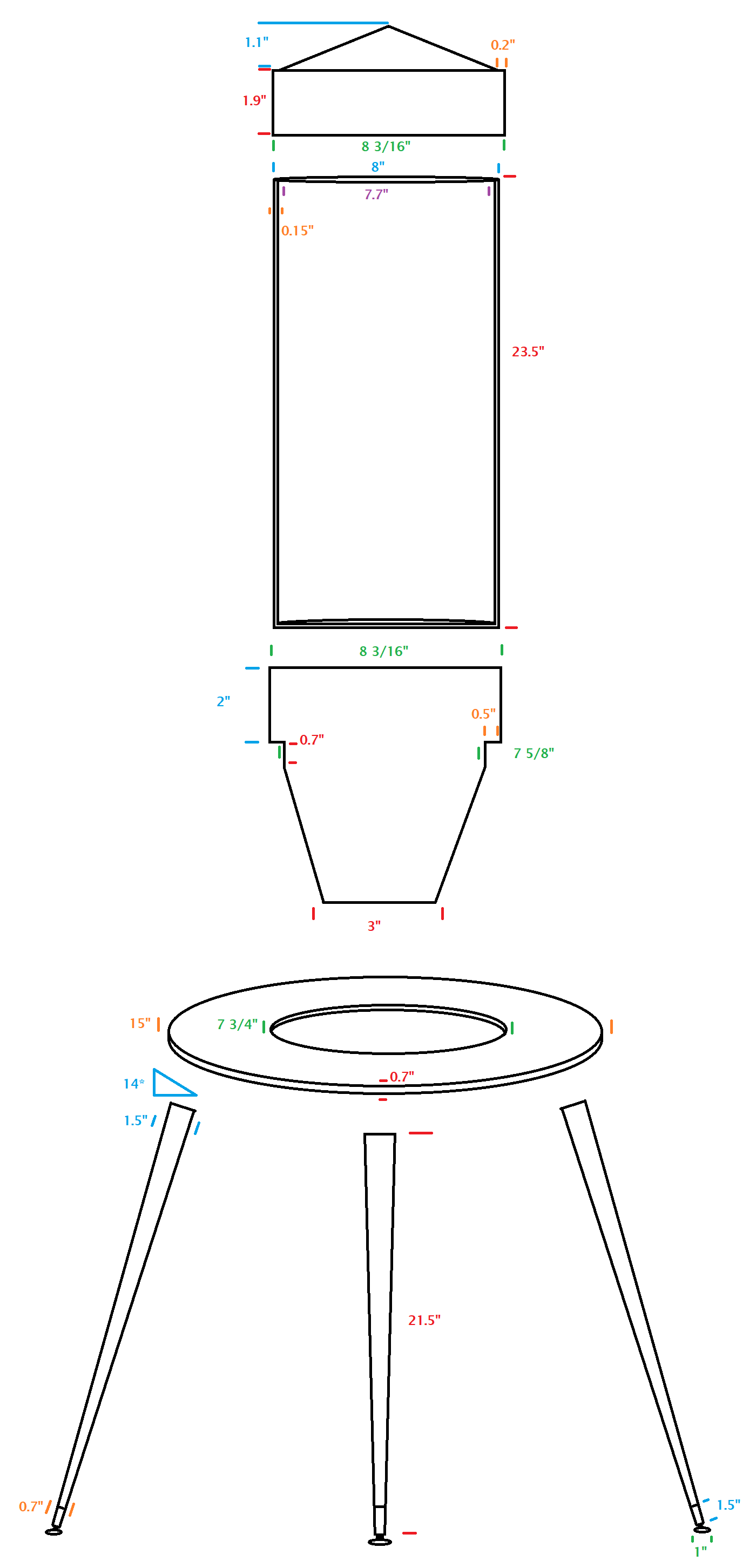 15″ outer diameter with 7 3/4″ diameter hole for globe. Made from particle board with a walnut laminate top.