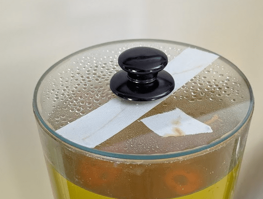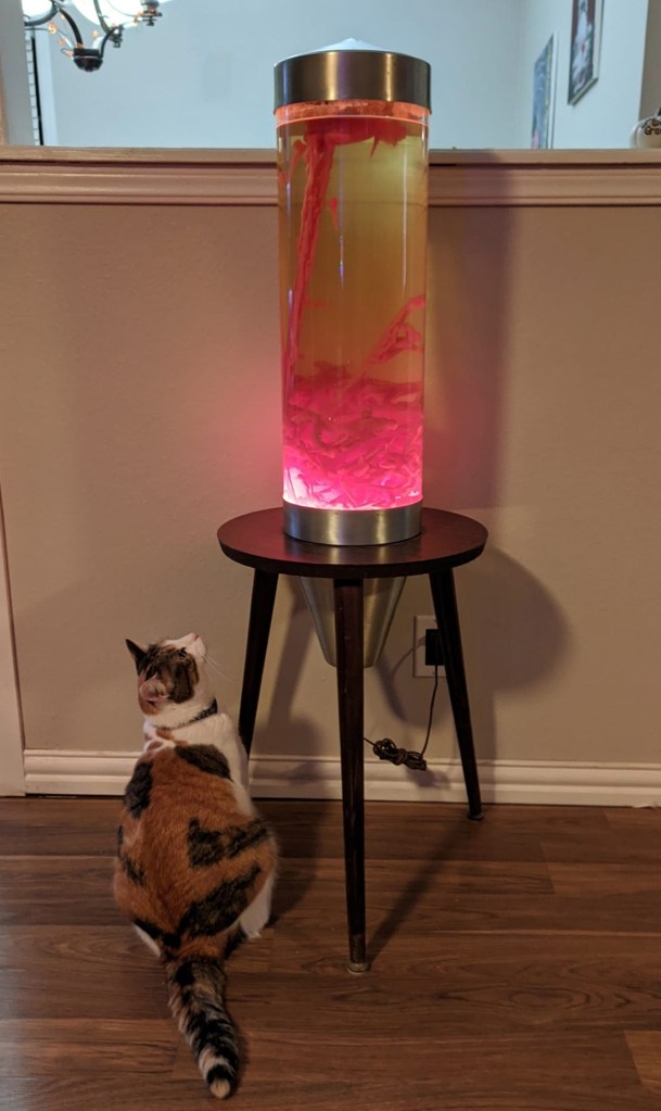 Originally I thought restoring the original seal would be fine, but I noticed a smell from the lava lamp when it was running. It was also leaking down the side of the glass. I didn’t want to glue the original cap back on so I tried making a cap out of acrylic, but that cracked after a while. Eventually I found a round piece of tempered glass that fit perfectly and it had a vent hole in the middle. I glued it on with silicone and covered the hole with the same athletic tape as earlier so it can breath without letting fluid out.