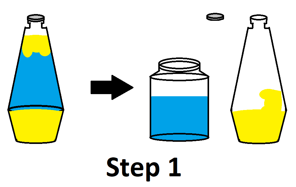 Step 1 involves letting the lamp completely cool to room temperature, removing the bottle cap from the globe, and pouring the master fluid into a clean jar. The two bunches of wax should now be sitting at the bottom of the globe. A Guide for removing the cap and recapping the lava lamp bottle can be found here.